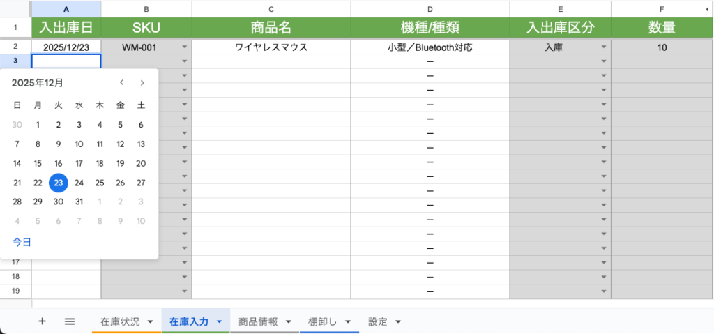 2. A列に入出庫日を入力