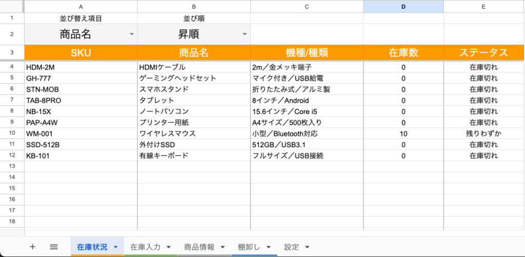 「在庫状況」シートで、現在の在庫数とステータスを確認できます。