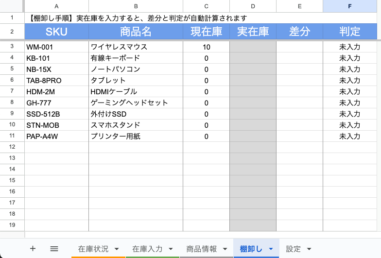 3. D列に実際にカウントした在庫数を入力