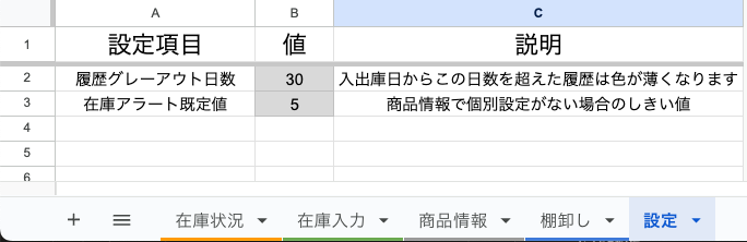 5. D列にアラートしきい値を入力(この数以下になると「残りわずか」と表示されます)