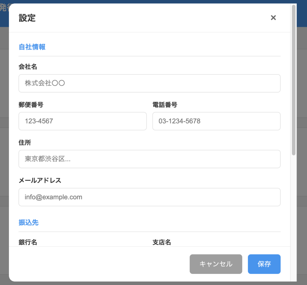 請求書・領収書を発行する前に、まず自社情報を設定します。