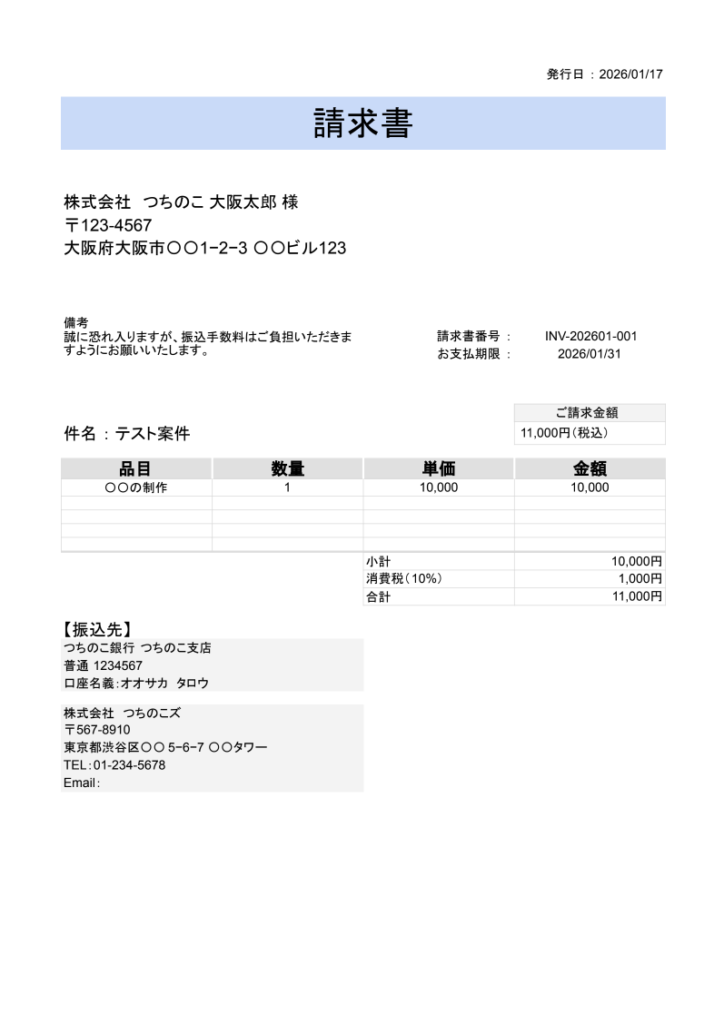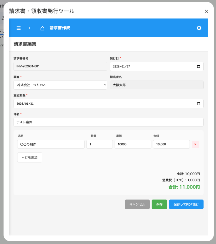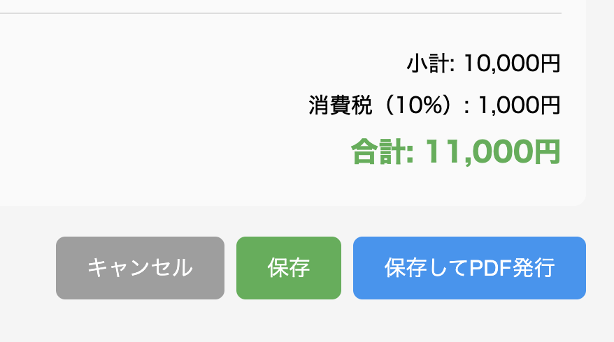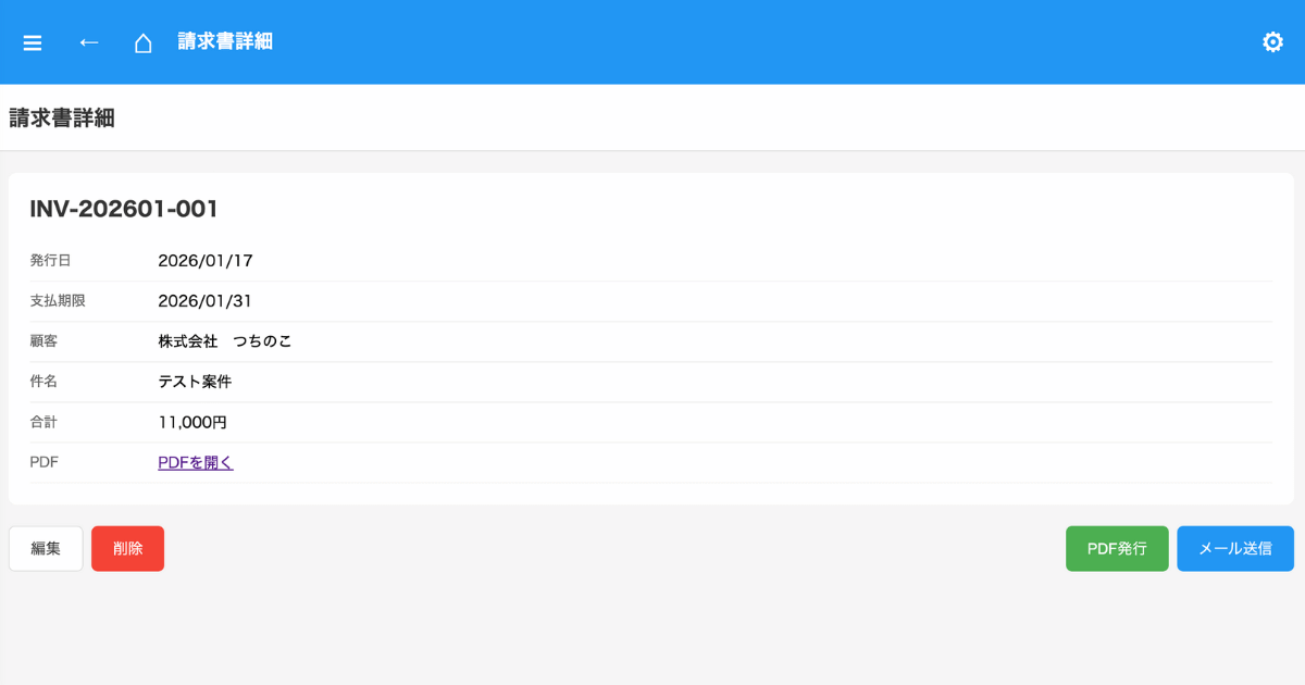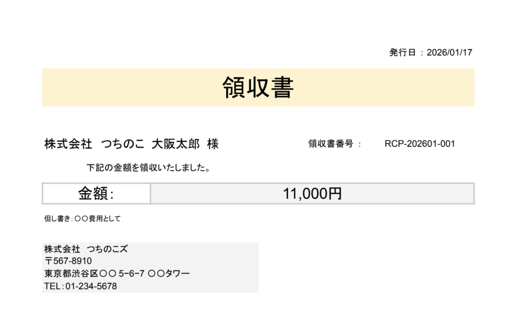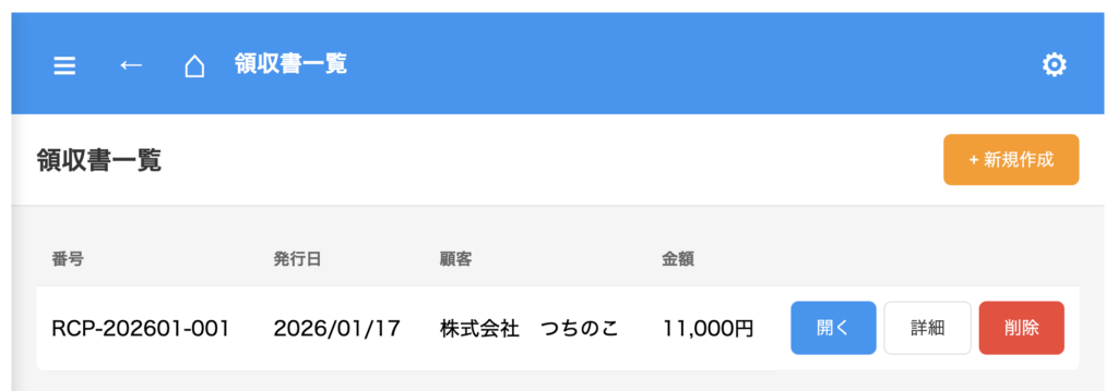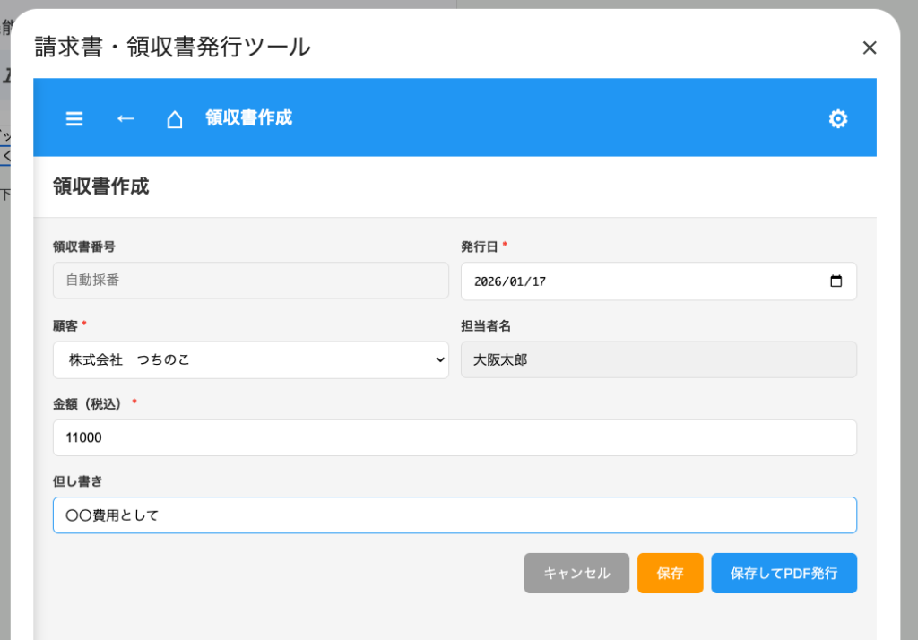 請求書と同様の操作で、領収書も作成・PDF発行・メール送信ができます。