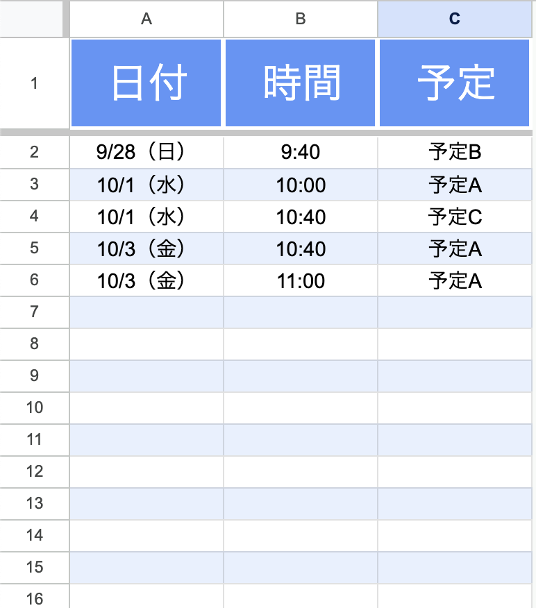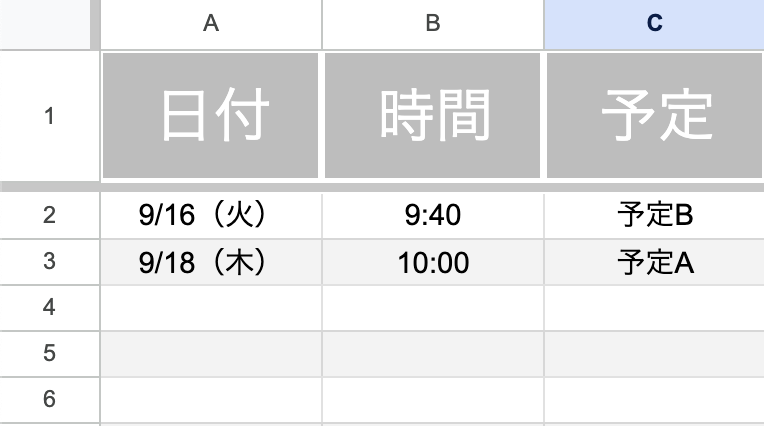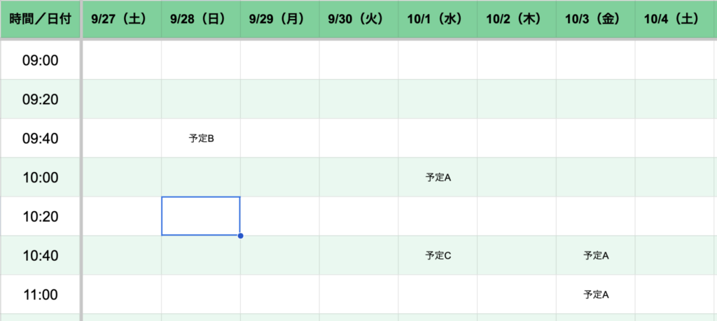 横軸に日付、縦軸に時間枠。1シートでチーム全体の予定を俯瞰できます。