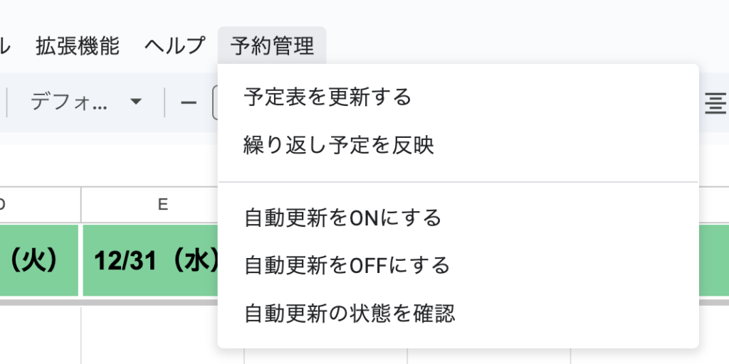 スプレッドシートを開くと「予約管理」メニューが表示されます。