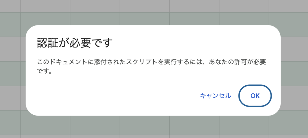 これはスプレッドシートに組み込まれたプログラムを実行するために必要な手続きです。一度承認すれば、次回以降は表示されません。