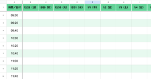 そこで、時間×日付のマトリクス表示でチームの予定を一覧管理できるスプレッドシートを作成しました。