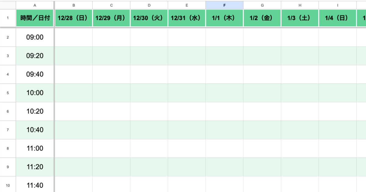 時間の刻み幅は設定シートで変更できます(初期設定は20分刻み)。30分刻み、1時間刻みなど、用途に合わせて調整してください。